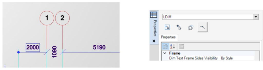 An ability to add a visible text frame to dimensions has been introduced at this release. The functionality is available for all dimension types. The frame properties can be modified via the Dim Text Frame Sides Visibility in the Properties Grid for a dimension or, alternatively, for an individual dimension text via the Vertex Editor.