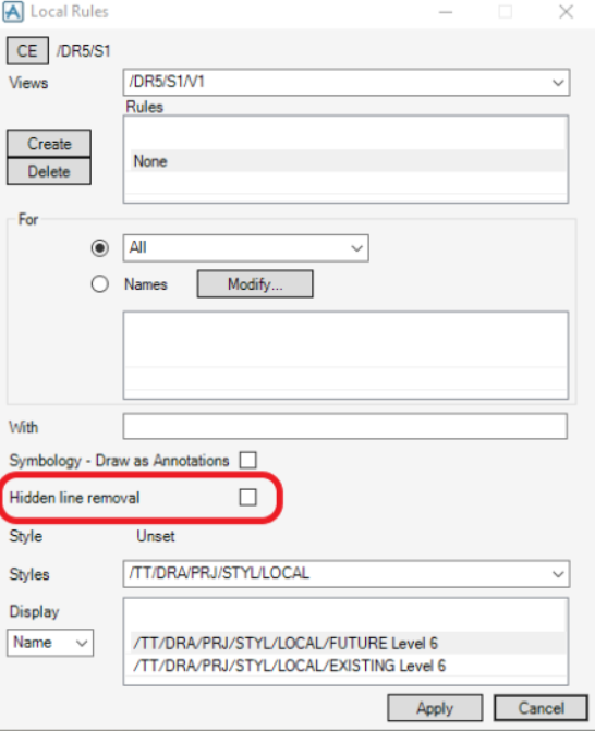 A Hidden line removal toggle has been introduced to the Local Rules form to allow the NoHLR flag to be controlled on rule creation.