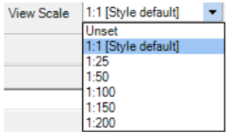 The default value is set to Unset which results in the scale being automatically calculated to the defined frame. If the View Style has a pre-defined scale, this will be used as a default value. All scales derived from a View Style have an additional postfix [Style default].All scale values are Metric and where the View Style pre-defined scale is in another system, it will be automatically converted.The View Scale value will define the size of the view frame (if unset it will not affect the view frame).