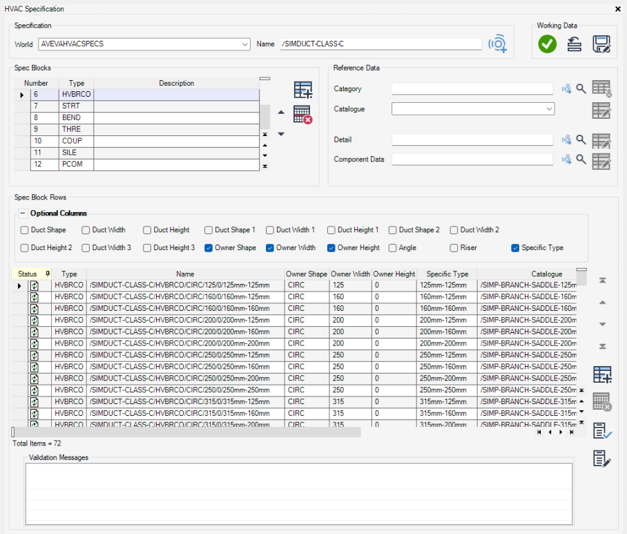 Specifications are a key new area for the HVAC application and behave in a similar manner to piping specifications. Instead of bore as a mandatory column heading we have shape, width, and depth